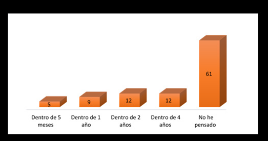 Al preguntarles a los estudiantes sobre su proyección a futuro, en la Figura 7 se observa que la gran mayoría no ha pensado cuándo pondrá en marcha su emprendimiento (61%).