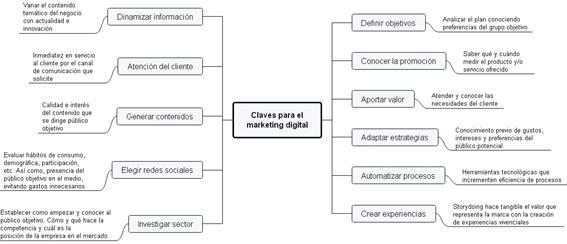 El marketing digital o mercadeo en línea, es una nueva forma de marketing que emplea tecnología digital a sus estrategias de comunicación y comercialización de productos y/o servicios, mejorando la experiencia del usuario (Peçanha, 2021; Fuente, 2022). En este sentido, la importancia del marketing digital ayuda al emprendimiento y crecimiento de las nuevas empresas que se integran al mundo digitalizado; en donde el internet es una herramienta y fuente clave para obtener presencia y beneficios financieros (Vergara, 2021). Por ende, la competitividad a nivel mundial y de la situación de países en desarrollo revela la necesidad del emprendimiento, conocimiento de estrategias y herramientas digitales aplicadas al marketing. De tal manera, que permitan optimizar los negocios alcanzando fidelización y conexión con los posibles clientes (Loayza et al., 2020). La Figura 4, ilustra las claves para el marketing digital.