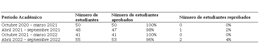 En la Tabla 1, se presenta el registro de estudiantes de la asignatura de Emprendimiento período octubre 2020 – marzo 2021 hasta abril – septiembre 2022. Los datos que se aportan son cuantitativos longitudinales con número de estudiantes en cada período e índices de aprobación y reprobación en la asignatura de Emprendimiento de la carrera técnica de la IES analizada.
