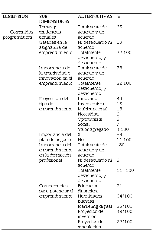 Por otra parte, mediante la encuesta se obtuvo la percepción de los estudiantes que cursan contenidos programáticos y condiciones de emprendimiento de la IES investigada. Es por ello, que en la Tabla 2, se muestra los resultados obtenidos de acuerdo a la dimensión o variable contenidos programáticos.