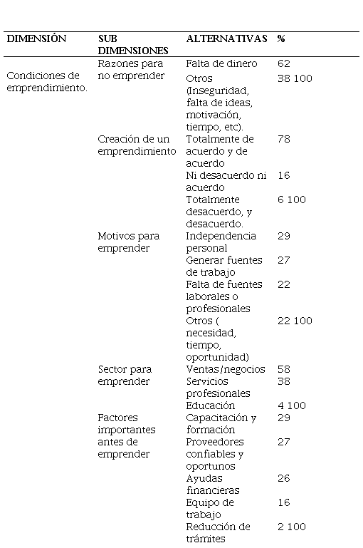 Por otra parte, se evidencia en la Tabla 3, la dimensión de las condiciones emprendimiento de la IES investigada. Por ello, se muestran las razones que limitarían al estudiante universitario a crear un emprendimiento, siendo en un 62 % la falta de dinero como la principal razón para no emprender. Es por esta razón que, en Ecuador el costo de iniciación de un emprendimiento es alto y los trámites de constitución dificultan aún más la operación de un negocio (Ecuador Chequea, 2021). Además, en la Tabla 3 se muestra que 78 % de los estudiantes encuestados está de acuerdo y totalmente de acuerdo con la creación del emprendimiento. Seguido, se muestra el motivo de emprender siendo 29 % independencia personal, 27 % generar fuentes de trabajo y 22 % falta de fuentes laborales. Esta percepción no es tan ajena a lo que señala Vélez et al., (2020) escasez de empleo 83 %, innovación del mercado 52 %, acumulación de riqueza 37 % y negocio familiar 36 %.