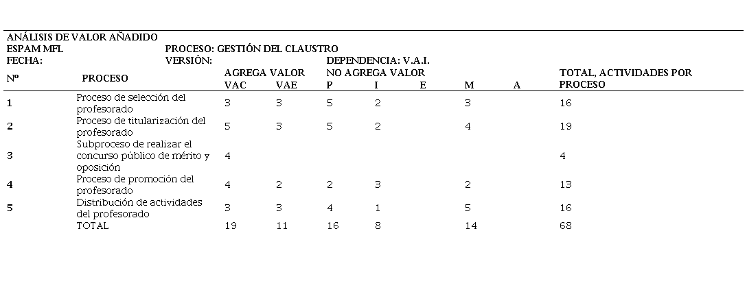 La aplicación de metodologías de mejora a los procesos de gestión del profesorado de la ESPAM MFL, dio como resultado, un índice de valor añadido deficiente, por la existencia mayoritaria de actividades que no agregan valor, como las de preparación y movimiento; datos que tienen similitud con los encontrados por Montesdeoca y Zambrano (2017) en su tesis titulada “Propuesta de mejora a los procesos de escritura de libros y artículos científicos de la ESPAM MFL”, quienes concluyeron que los ya mencionados en este título después de ser aplicada la misma metodología, presentaron ineficiencia, dada por el tiempo que se desperdicia en envío de documentos y trámites innecesarios. Con estos resultados se destaca la importancia del análisis del valor añadido para incrementar la eficiencia de los procesos, ya que a través del examen detallado de cada fase se puede determinar si contribuyen a las necesidades o requisitos de los grupos de interés, para luego proceder a optimizar las actividades que aportan valor añadido y eliminar las que no aportan ninguno. (Trischler, 1998)