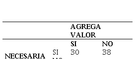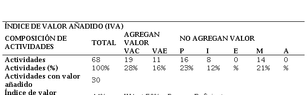 Mientras tanto, el cálculo del IVA representado por la tabla 4, dio como resultado, 44% de valor añadido, equivalente a 30/68 tareas que generan valor, lo cual indica que el proceso es deficiente, puesto que el IVA es menor al 50%.