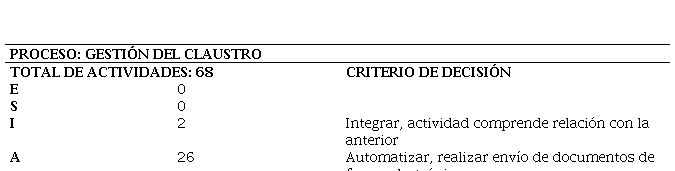 Dada la aplicación de la metodología del ESIA, Tabla 6, a todos los procesos, se propone la automatización de 26 actividades (A del ESIA) mediante el envío de la información concebida en estas, a través de medios electrónicos; por otra parte, para 2 actividades, se propone la integración (I del ESIA) con la actividad anterior, ya que ambas son entradas iniciales de datos.