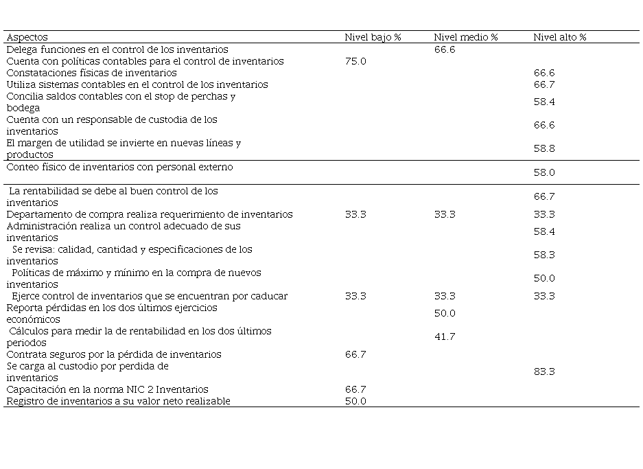En los niveles altos, se destaca la realización de constataciones físicas de inventarios, el uso de sistemas contables para el control, la conciliación de saldos contables, la percepción de que la rentabilidad se debe al buen control de inventarios, entre otros aspectos positivos. Sin embargo, estas fortalezas coexisten con ciertas debilidades, como el conteo físico realizado con personal externo, lo que podría afectar la precisión del proceso.