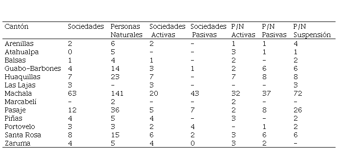 Analizando el cantón Machala objeto de nuestro estudio se han constituido 63 sociedades de las cuales se encuentran activas el 31.75%, mientras que las empresas pasivas, pero no disueltas comprenden el 68.25%. En cuanto a las farmacias creadas por las personas naturales con un total de 141. De las cuales se encuentran activas el 22.69%, mientras que el 26.24% no están realizando ninguna actividad económica y finalmente el 51.07% se encuentran totalmente suspendida.