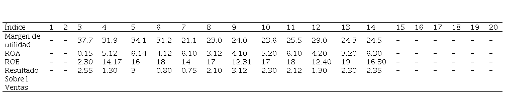 En la Tabla 4 se muestra dentro del primer indicador sobre margen de utilidad se obtiene de dividir la utilidad bruta sobre las ventas netas al que hay que multiplicar por 100. Esto permitió conocer la eficacia operativa de las empresas, es decir, que la sociedad ha utilizado sus activos eficientemente, también es necesario puntualizar que si este indicador se va incrementando de manera periódica es una buena señal y si sucede lo contrario la administración debe buscar la reducción de los costos lo que le permitirá incrementar la utilidad. Cuando se presenta un margen de utilidad del 5% es bajo, si alcanza hasta el 10% es promedio y si logra más del 20% es que el margen de rentabilidad es bueno.