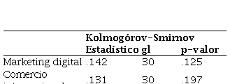 En la Tabla 10 se puede observar que la prueba de normalidad de Kolmogórov-Smirnov (n>=30) del marketing digital y el comercio internacional tuvo un p-valor de 0.125 y .197 respectivamente ambos mayores que .05 por lo que las puntuaciones de estas variables tienden a una distribución normal univariante, es decir que para analizar la correlación entre ellas se utilizó el coeficiente de Pearson y para la influencia la regresión lineal.