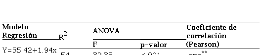 En la Tabla 7 se muestra que el coeficiente de determinación establece que el 54% de la variabilidad en el comercio internacional se debe a la influencia de la comercialización, así mismo el modelo de regresión indica que por cada unidad que aumenta la comercialización, el comercio internacional aumenta en 1.94 puntos, también el análisis de varianza (ANOVA) tiene un p-valor de .000 menor que .01, por lo que el modelo encontrado es adecuado, es decir la comercialización influye significativamente y de manera positiva en el comercio internacional. Además, según el coeficiente de Pearson (.733) existe una correlación positiva alta entre las variables.