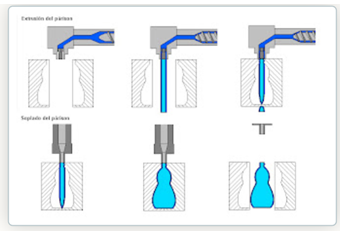 Moldeo por soplado. El proceso de moldeo por soplado viene del concepto de soplar vidrio. Este proceso consiste en introducir plástico derretido en forma de tubo que es conocido como “parison” (Figura 2). Este parison cae dentro de un molde para ser enfriado mientras se le inyecta aire para tomar la forma que se está buscando (Spalding y Chatterjee, 2017).