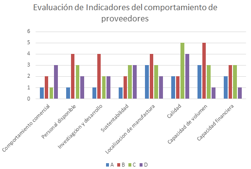 En este estudio es notable que la base de proveedores actual es muy pobre, al revisar los diferentes indicadores y darles la importancia adecuada es notoria ventaja que el proveedor B tiene sobre los otros tres, al tener esta situación es posible entender que se necesita seguir trabajando para mejorar los indicadores de los otros tres posibles licitadores. El desarrollo de la cadena de suministro ayudara a la competitividad y poder obtener un mejor producto basado en la calidad y expectativas de los usuarios, pudiendo elegir entre un proveedor u otro y no estar atado a lo que dicta el único competidor capaz