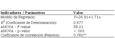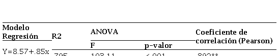 En la Tabla 1 se muestra que el modelo de regresión presentado es Y=8.57+0.85+Y=8.57+0.85x. Esto sugiere que por cada unidad que aumenta en el conocimiento del Régimen Único Simplificado (RUS), el cumplimiento tributario aumenta en 0.85 unidades. Esta relación lineal entre las dos variables se puede considerar en el contexto de cómo el conocimiento del RUS afecta el cumplimiento tributario.