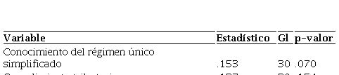 Para determinar si las puntuaciones de las variables "Conocimiento del régimen único simplificado" y "Cumplimiento tributario" se distribuyen normalmente, se utilizó la prueba de Kolmogórov-Smirnov. Ambas variables presentan p-valores superiores a 0.05 (0.070 y 0.154 respectivamente), lo que sugiere que las puntuaciones tienden a seguir una distribución normal univariante. Esto implica que, para el análisis de correlación entre estas variables, se empleó el coeficiente de correlación de Pearson, y para la influencia, se utilizó la regresión lineal.