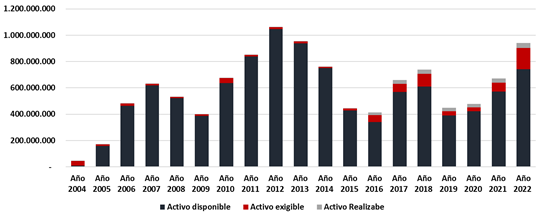 En cuanto al activo disponible, se aprecia un aumento progresivo durante el periodo analizado. Comenzó con 8.565.984 Bs. en 2004 y experimentó un crecimiento constante hasta alcanzar su punto más alto en 2022 con 740.623.171 Bs. Esto sugiere un incremento en los recursos financieros líquidos disponibles para la institución a lo largo del tiempo.