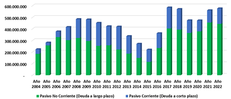 En la Figura 3 se expone la evolución significativa en el endeudamiento de la Gobernación a lo largo del tiempo, abarcando el período comprendido entre 2004 y 2022, y muestra claramente dos ciclos distintos. El primero, que se extiende desde 2004 hasta 2015, exhibe una parábola cóncava en la curva, lo que indica un aumento inicial para luego disminuir progresivamente. Por otro lado, el segundo ciclo muestra un notable aumento en el pasivo total, incluyendo tanto el pasivo no corriente como el pasivo corriente. Este análisis demuestra que la Gobernación ha experimentado variaciones en su estrategia de endeudamiento a lo largo de estos años, adaptándose a las condiciones económicas y las necesidades financieras en cada período específico.