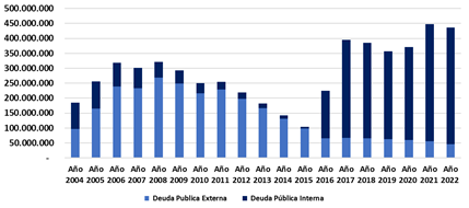 En el año 2004, la Deuda Pública Externa era de 96.435.287 Bs., mientras que la Deuda Pública Interna ascendía a 88.285.040 Bs., sumando un total de 184.720.328 Bs. de Deuda Pública Total. Durante el periodo comprendido entre 2006 y 2011, la deuda pública externa fue el recurso principal utilizado, alcanzando su punto máximo en 2006 con 238.969.544 Bs. Sin embargo, a partir de ese año, comienza una disminución gradual de la Deuda Pública Externa hasta llegar a 45.494.918 Bs. en 2022.