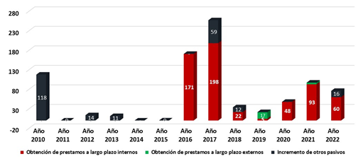 La Figura 5 muestra que durante el lapso comprendido entre 2010 y 2015, no se registraron adquisiciones de recursos mediante deuda pública, ya sea de fuente interna o externa. No obstante, se lograron obtener fondos mediante el incremento de otros pasivos. A partir del año 2016, se pudo observar un marcado incremento en la adquisición de préstamos internos, que durante el período 2016-2022 totalizó la suma de Bs. 595,94 millones. Paralelamente, el incremento de otros pasivos distintos a la deuda pública asumió el rol de segunda fuente de financiamiento, con una acumulación de Bs. 87,45 millones. Con respecto a la deuda pública externa, esta experimentó un aumento de Bs. 20,89 millones en el periodo que abarca desde 2015 hasta 2022