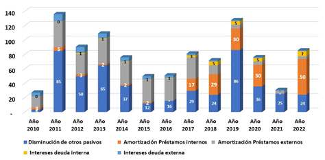 La Figura 6 muestra que, en cuanto a la amortización de la deuda, se destaca que la reducción de otros pasivos ha sido significativa en comparación. Se logró conciliar un total de Bs. 412,12 millones en el período que abarca desde 2010 hasta 2022, en concepto de devolución de deudas con empresas de construcción, comercios y otros actores.