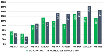 Durante el período 2010-2022, la ejecución presupuestaria de la Gobernación de Potosí ha sido insuficiente, quedando por debajo del umbral del 90%. Este bajo rendimiento no solo refleja desviaciones en la ejecución de programas operativos anuales sino también otras posibles falencias que han afectado los resultados de los planes estratégicos establecidos.