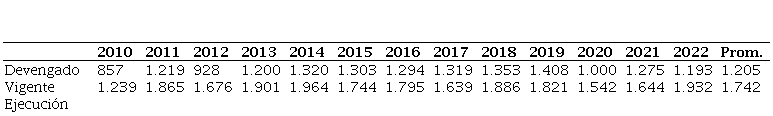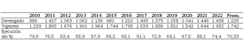 En la Tabla 1 se revela que la ejecución presupuestaria ha sido insatisfactoria, alcanzando un promedio del 70,33% durante los trece periodos analizados que, según los criterios de eficiencia establecidos por el Ministerio de Planificación, se considera eficiencia moderada cualquier valor dentro del rango de 50% al 74.99%. Es importante destacar que esta eficiencia moderada se presenta en todos los periodos, a excepción del año 2017 donde se presenta eficiencia relevante
