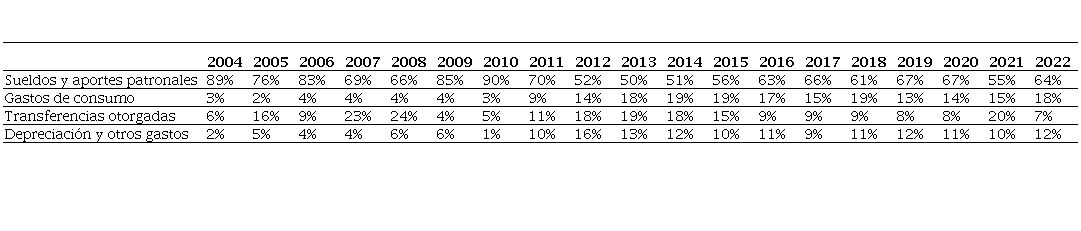 La Tabla 4 expone que, durante el análisis de 19 años de gastos, se destaca que los salarios y aportes patronales han sido el elemento más utilizado, representando un monto de Bs 7.729.799.351, equivalente al 67,8% de los egresos de la Gobernación de Potosí. En otras palabras, casi Bs. 68 de cada Bs. 100 gastados se destinan a sueldos y aportes patronales. Además, los gastos de consumo han experimentado un notable incremento desde el año 2012, llegando a representar Bs. 1.249.428.292, es decir, un 10,96% del total. Por otro lado, las transferencias alcanzaron un monto de Bs. 1.456.352.136.