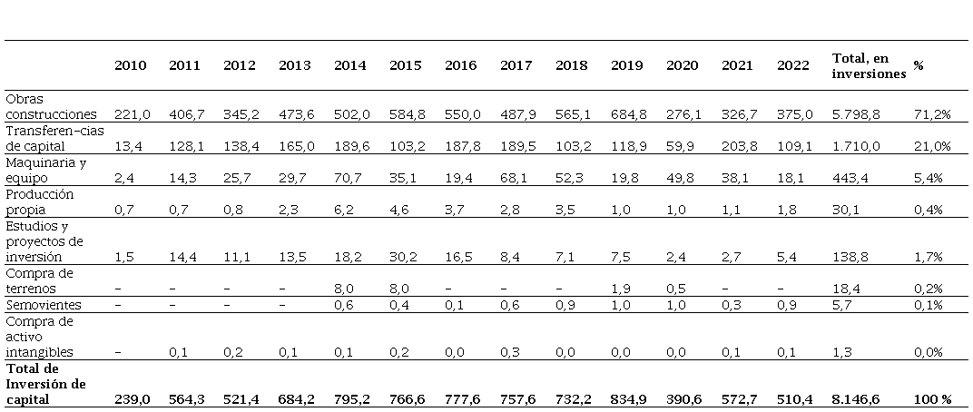 Mientras que en la Tabla 5 se muestra que el total de gastos de capital ha superado Bs. 8.146,6 millones en las trece gestiones, la principal inversión ha sido obras en construcciones aproximadamente Bs. 5.798,8 millones. El periodo de mayor gasto de capital se produjo entre los años 2013 – 2019, siendo Bs. 5.348 millones