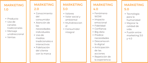 En este sentido, el marketing ha evolucionado con el tiempo hasta contar con potentes herramientas para satisfacer necesidades. Además, ha enmarcado diferentes enfoques desde su aparición posterior a la Revolución Industrial en el área de negocios. Como bien lo propuso Kotler et al. (2021) y se ha esquematizado en la Figura 1, en sus inicios se centró en la producción y los productos; en el consumidor; luego, en las emociones y valores; anticipación; y posteriormente en la tecnología para la humanidad.