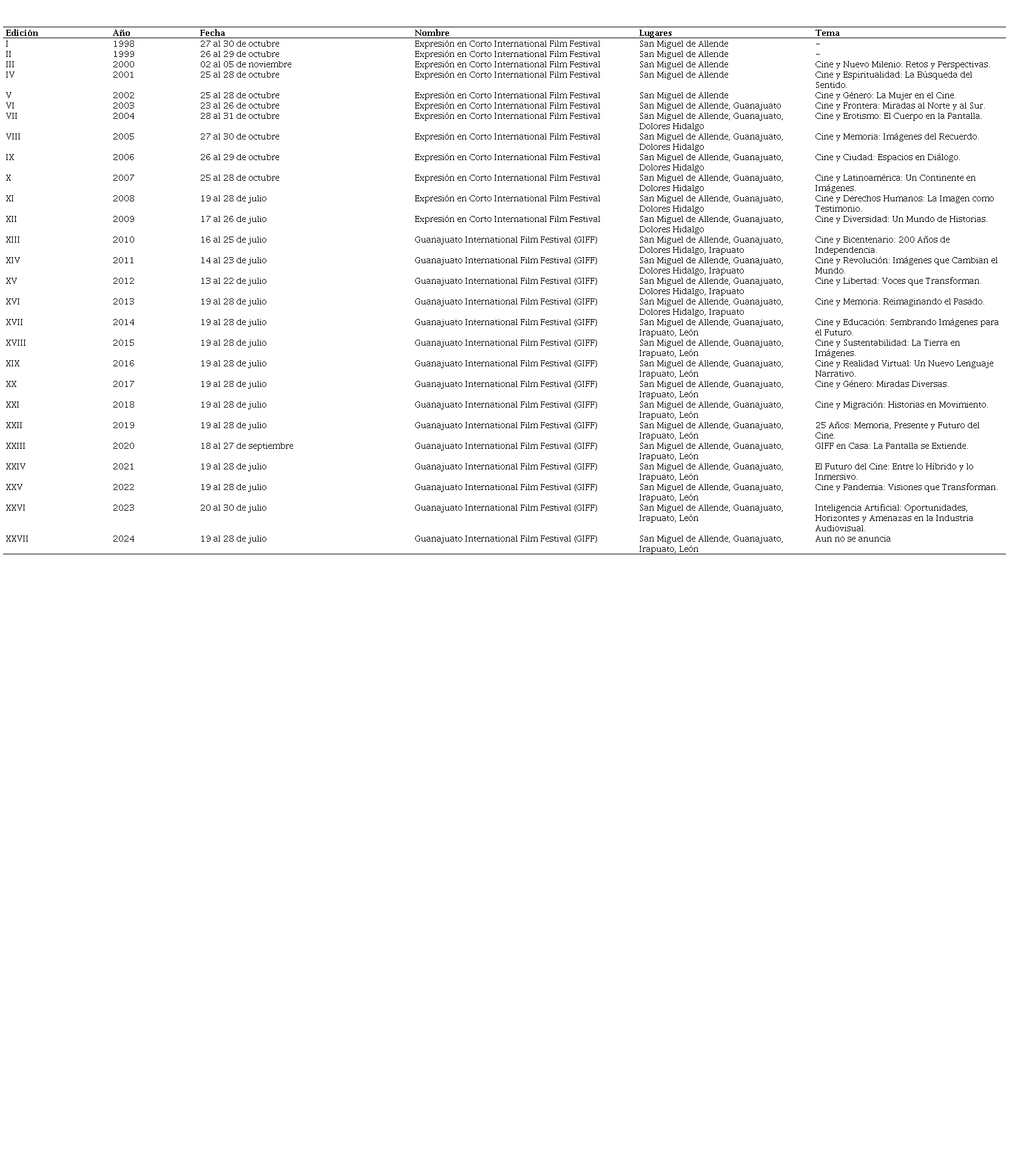 En la Tabla 1 se muestra un resumen de las ediciones de GIFF, en la que se lista el nombre que ha recibido el evento, los lugares en los que se ha efectuado y el tema que se ha abordado en cada una. Como se puede apreciar el festival se ha realizado en varias ocasiones en el mes de julio y octubre. En sus inicios se comenzó a realizar en las ciudades de San Miguel de Allende y luego se extendió a la capital de Guanajuato, Dolores Hidalgo, Irapuato y León.