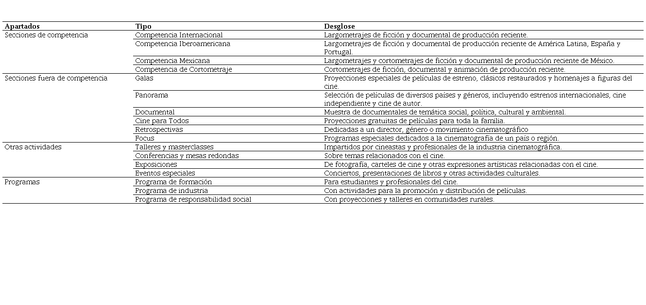 Los contenidos que ha abarcado GIFF, como se puede apreciar en la tabla 2 son muy variados y abarcan la mayoría de las experiencias fílmicas de las tendencias actuales en el séptimo arte, y al que distintos públicos pueden acceder para disfrutar de los trabajos actuales de México y el mundo. Es sin duda, una muestra constante del talento cinematográfico, lo cual se relaciona con múltiples esfuerzos para la proyección profesional.