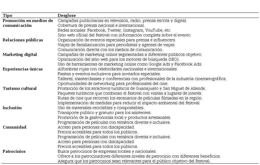 En otro orden de ideas, como parte del atractivo turístico que caracteriza a Guanajuato y San Miguel de Allende, se sacó provecho de esto en la publicidad de GIFF. Para ello se promocionaron estos destinos turísticos destacándose el valor cultural que poseen. Además, se diseñaron paquetes turísticos que combinaban el festival con visitas a lugares de interés, se programaron rutas de cine que recorren los escenarios de películas filmadas en la región, y se implementaron medidas para reducir el impacto ambiental del festival. Olguín et al. (2020), también avala la propuesta de marketing turístico como estrategias promocional, en su caso para la ciudad de Bahía de Caráquez, en Ecuador, como parte del interés de que se impulsara la actividad turística en esta localidad.