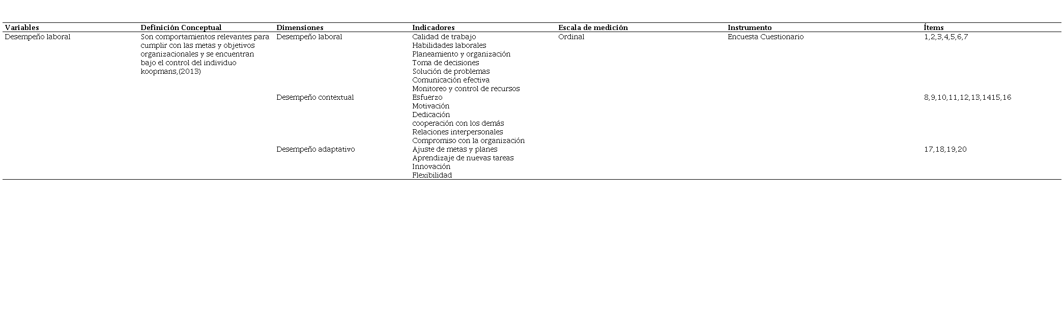 Las preguntas del cuestionario se estructuraron por dimensiones: Desempeño laboral: ¿Usted se siente cómodo con las condiciones laborales que le ofrece la empresa en su puesto de trabajo? ¿Trabajas con optimismo y confianza para alcanzar los objetivos organizacionales? ¿Tus opiniones son tomadas en cuenta para resolver problemas laborales o plantear estrategias organizacionales? ¿Usted tiene Capacidad para resolver conflictos? ¿Mantiene comunicación con sus subordinados? ¿Usted Posee autonomía para tomar sus propias decisiones? ¿El Gerente verifica que se cumplan correctamente los objetivos organizacionales?