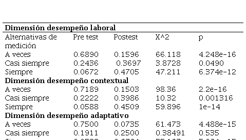 La Tabla 3 muestra que el programa de coaching mejoró aspectos clave de la dimensión desempeño laboral de los empleados, como la satisfacción con las condiciones de trabajo, el optimismo y confianza, la participación en la toma de decisiones, la resolución de conflictos, la comunicación con subordinados, la autonomía en la toma de decisiones y la verificación de objetivos por la gerencia. Esto se tradujo en un mejor desempeño laboral y eficacia organizacional. En el caso de la segunda dimensión evaluada, desempeño contextual, los resultados también indican que el programa de coaching tuvo un impacto positivo en estas áreas, mejorando el desarrollo de habilidades, la motivación, el compromiso, la colaboración y la alineación de los empleados con los objetivos organizacionales. Finalmente, al evaluar la dimensión de desempeño adaptativo antes y despúes de aplicado el programa los resultados muestran que después del programa de coaching hubo una mejora en estas habilidades adaptativas de los empleados.