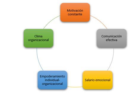 En la Figura 6, se puede observar la relación cíclica y constante que debe existir entre los diferentes aspectos: motivación constante, comunicación efectiva, salario emocional, empoderamiento individual- organizacional y clima organizacional.