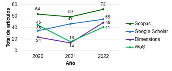 El tema de investigación se encuentra activo, esto se pudo apreciar con el análisis de la cantidad de trabajos recuperados de las cuatro bases de datos bibliográficas, que fueron publicados en los últimos tres años donde se enmarcó el estudio (del 2020 al 2022). Como se muestra en la Figura 1, correspondieron 195 que representan un 68,42% del total recuperado con Scopus, 137 para un 55,69% con Google Académico, 87 que representan un 27,88% con Dimensions y 102 que representan un 30,45% con Web of Science. El comportamiento muestra una ligera desaceleración de publicaciones en 2021, con un total de 136 artículos publicados, frente a los 168 que tuvieron lugar en el 2020, esto puede deberse a la pandemia de COVID-19.