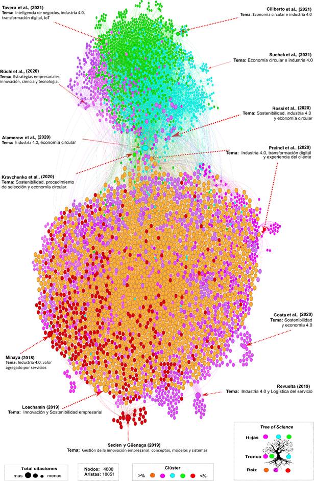En cuanto a los autores categorizados como “Tronco”, Preindl et al. (2020) trabajan los temas de la Industria 4.0, la transformación digital y la experiencia del cliente para la cadena de suministro, y cómo se crean nuevas oportunidades para las empresas con el desarrollo de nuevas habilidades y capacidades para gestionar el proceso de transformación. En el caso de Rossi et al. (2020), indagan entre otras cosas sobre sostenibilidad y economía circular. Los autores proponen un nuevo método y herramienta para analizar casos de estudio con el fin de demostrar cómo los modelos comerciales circulares pueden beneficiarse de la integración de activos inteligentes de la Industria 4.0.