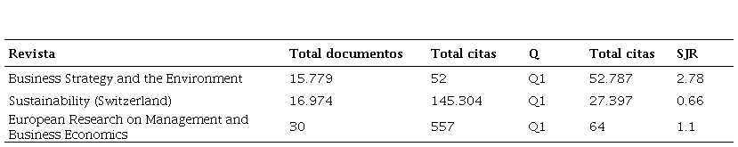 La revista con mayor número de documentos es Sustainability que incluye temas referentes al impacto de la integración de la Industria 4.0, las fuerzas organizacionales internas en el mantenimiento de las ventajas competitivas y el logro de los objetivos estratégicos. En segundo orden esta la revista Business Strategy and the Environment con tópicos relacionados con la innovación y economía circular. Otra que se destaca es la European Research on Management and Business Economics con publicaciones en temas referentes a la innovación, la relación entre la digitalización y el desempeño económico y financiero, el efecto de la industria, servicios, crecimiento económico, clústeres para la difusión del conocimiento y los beneficios de la innovación y competitividad empresarial.