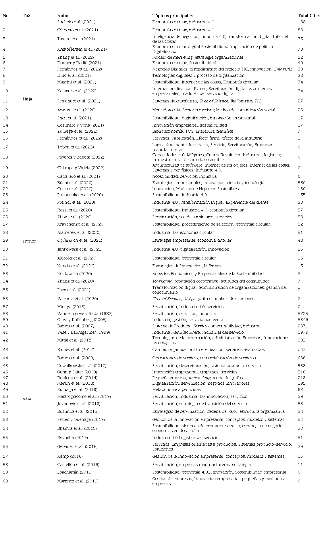 Para el análisis de tendencias en la literatura científica, se empleó la herramienta disponible en https://coreofscience.shinyapps.io/scientometrics/, la cual se conoce como Árbol de la Ciencia (Tree of Science - ToS) y categoriza los documentos científicos en Hojas, Tronco y Raíz, según la clasificación de Robledo et al. (2014). Esta herramienta permite visualizar los trabajos en un campo de conocimiento como un árbol, lo que facilita la identificación de los autores seminales, conectores y emergentes en el campo de investigación. En la Tabla 3, se presentan estos resultados con los principales tópicos y el total de citas de los autores hasta el cierre del estudio.