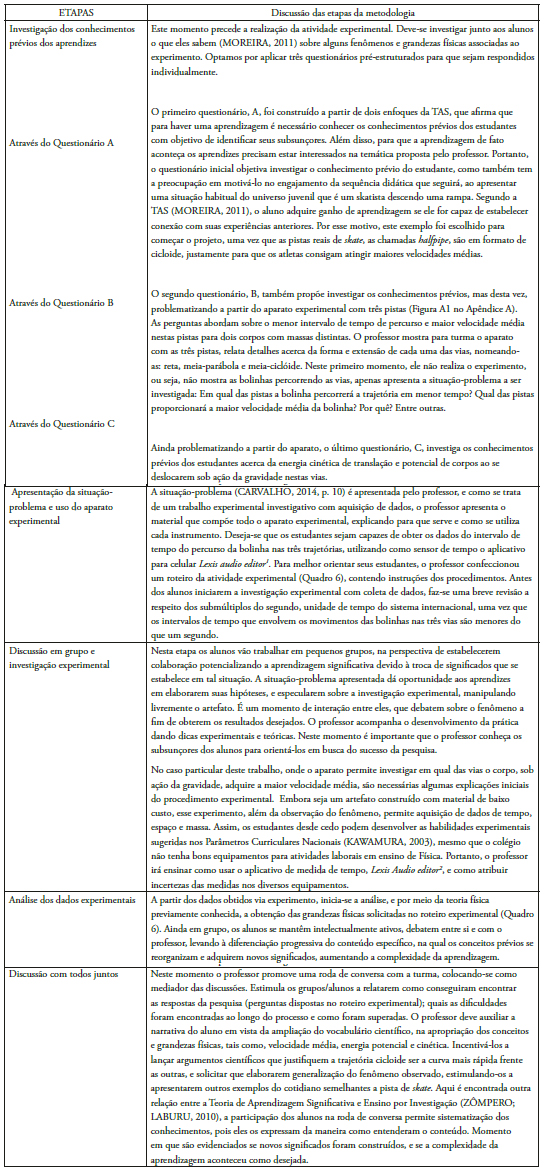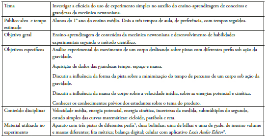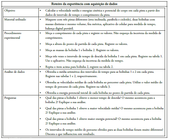 As perguntas de pesquisa tomaram a seguinte forma: O formato da trajetória influencia no tempo de percurso de um corpo sujeito a ação da gravidade? O menor tempo de descida de um corpo pode ser obtido através de um percurso mais longo? A velocidade média deste corpo pode ser maior se a distância percorrida for maior? Qual é a influência da massa do corpo sobre a velocidade média, sobre as energias potencial e cinética? Para aprendizagem desse conteúdo e compreensão dessas perguntas, aplicamos uma atividade experimental elaborada com material de baixo custo, que aborda aspectos fenomenológicos da cinemática e da dinâmica newtoniana, assim como permite aquisição de dados de grandezas físicas elementares: tempo, espaço e massa. Na atividade experimental foi utilizado o aplicativo de celular Lexis Audio Editor como instrumento de medida do tempo.