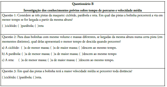 Em seguida, os alunos são desafiados a responder as questões investigativas contextualizadas no movimento de uma bolinha nas pistas da maquete experimental (Figura A1 no Apêndice A). Mas, uma vez, vale ressaltar que neste momento de investigação dos conhecimentos prévios, o professor não realiza o experimento, ele apenas apresenta a maquete discorrendo sobre a funcionalidade dela, e pede para que os alunos respondam o questionário B do Quadro 4. A primeira e terceira pergunta deseja investigar os conhecimentos prévios dos estudantes a respeito da influência da forma da trajetória no tempo de percurso, e na velocidade média do objeto ao descer pelas vias em formatos distintos por ação da gravidade2. O objetivo dessas perguntas era conhecer a estrutura cognitiva dos estudantes sobre essas grandezas, a fim de revelar a presença ou não de subsunçores. Vale ressaltar que os estudantes já haviam tido aula teórica de cinemática.