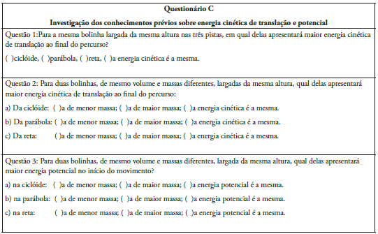 As questões 2a, 2b e 2c do Questionário B no Quadro 4; assim com as questões 2a, 2b, 2c, 3a, 3b e 3c do Questionário C no Quadro 5 investigam os conhecimentos prévios dos estudantes acerca da influência da massa sobre o tempo do percurso, sobre as energias cinética e potencial nas três pistas.