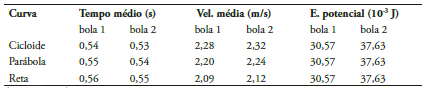 Através da teoria previamente estudada e com os dados do tempo mínimo em cada pista, os alunos calcularam a velocidade média das duas bolinhas e suas respectivas energias potenciais em cada curva. Todas essas grandezas estão registradas na Tabela 1. Mesma surpresa se deu ao constatarem, através de seus cálculos, que a bolinha ao descer a cicloide adquire maior velocidade média do que na parábola ou na reta. Neste ponto, podemos ressaltar que o trabalho experimental permitiu seguir os passos do método científico em vista da aprendizagem significativa e não mecânica. Assim, os fenômenos e grandezas físicas vão sendo gradativamente internalizadas na estrutura cognitiva do indivíduo em acordo com os pressupostos científicos.