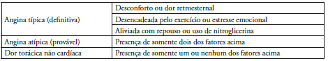 Diversas classificações já foram propostas e a mais utilizada é a que divide a dor torácica em três grupos: típica, atípica e não cardíaca (Quadro 1). Recomenda-se, portanto, que pacientes apresentando dor torácica sejam observados em sua história clínica, com detalhamento dos sintomas, além de exame físico completo e levantamento dos fatores de risco relacionados. Com essas informações, torna-se possível estimar a probabilidade de existir doença coronariana aguda, podendo-se presumir um risco baixo, moderado ou alto.