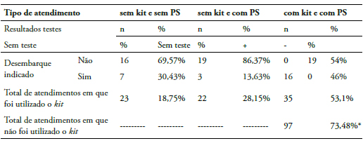 Pelos resultados desta pesquisa, evidenciamos que com o uso do kit diagnóstico e a avaliação de um profissional de saúde, as indicações dos desembarques realizados foram todas acertadas e necessárias, confirmadas no atendimento intra-hospitalar. Dentre as localidades sem o kit diagnóstico, mas com profissional de saúde, observou-se que há um menor número de desembarques do que quando sem kit e sem profissional de saúde. Entretanto, dos 3 desembarques de urgência (EVAM) realizados, 1 foi indevido após confirmação diagnóstica intra-hospitalar (33%). Por fim, quando não há kit e nem profissional de saúde, há maior número de desembarques indevidos (em 4 confirmou-se a síndrome coronariana aguda e em 3 (42,85%) o diagnóstico inicial de suspeita de SCA divergiu do diagnóstico final intra-hospitalar.