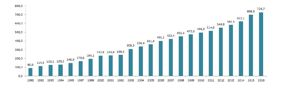 O saldo dessa ofensiva na particularidade brasileira foi um crescimento de 707% da população prisional entre 1990 e 2016 (BRASIL, 2017, p. 9), com o alcance ao terceiro contingente carcerário do mundo, com uma taxa de ocupação das unidades em quase 200% (Figura 1). Vale dizer que dos quatro países com a maior população prisional, o Brasil é o único que mantém crescimento nos índices de encarceramento e, se analisarmos por taxa de aprisionamento, por 100 mil habitantes nos países com população igual ou acima de 20 milhões, o país ocupa a terceira posição com uma taxa de 357.
