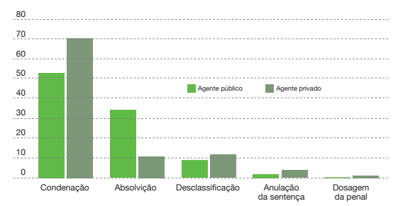 Já nos casos onde o agressor é o agente do Estado, sua chance é três vezes maior de absolvição que o sujeito privado, mesmo que a maioria dos casos denunciados digam respeito à violência praticada por policiais ou agentes penitenciários, cujas maiores motivações são o castigo para o agente privado e a obtenção de confissão para o funcionário público (Figura 2).