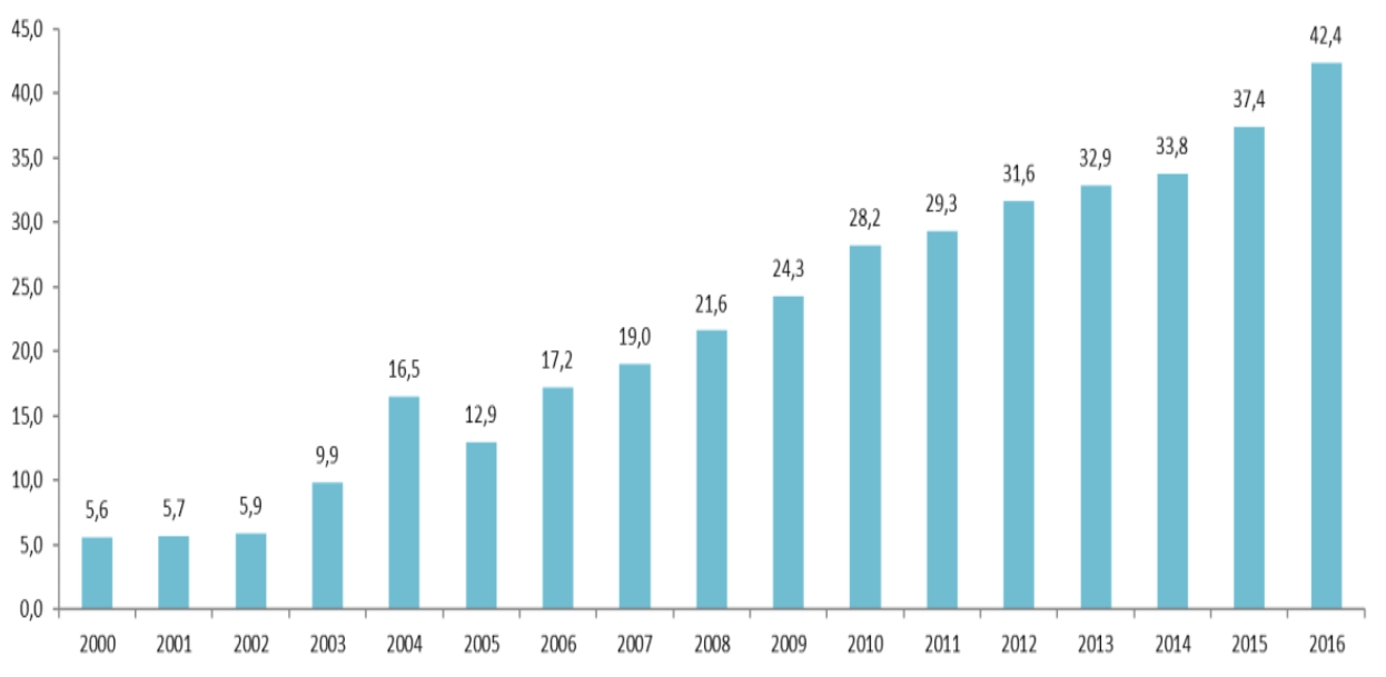 De acordo com dados do relatório INFOPEN/Mulheres (2014), no início da década de 2000, existiam 5.601 mulheres em situação de restrição de liberdade e em 2016, eram 37.380. Em 2016, mais de 42 mil mulheres presas (Figura 2), posiciona o país como o quinto no mundo com maior população prisional feminina, apenas atrás de Estados Unidos, China, Rússia e Tailândia.