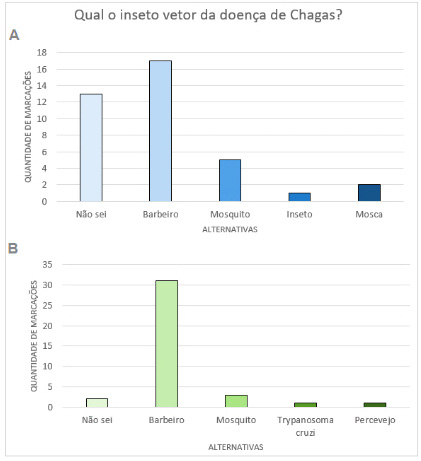 Relacionado ao nome do vetor da doença de Chagas, em Q1 (Figura 3-A), 45% dos alunos responderam corretamente o seu nome, enquanto 34% disseram não sabê-lo. Alguns dos alunos confundiram o inseto vetor da doença de Chagas com mosquito (13%) e mosca (5%). Poucos (3%) disseram apenas se tratar de um inseto, sem apontar qual. Após a aplicação do jogo, foi possível observar em Q2 (Figura 3-B) que 81% dos alunos alcançaram a resposta correta relacionada ao inseto vetor. Algumas confusões ainda permanecem, como confundir o vetor da doença (Barbeiro) com o parasito (Trypanosoma cruzi) (3%), e determinar o mosquito como vetor da referida doença (8%). Poucos alunos responderam Percevejo (3%) nessa questão, e a quantidade de resposta Não sei foi significativamente menor (5%) quando comparado a Q1 (34%). O jogo possibilitou melhor compreensão a respeito do vetor da doença de Chagas; entretanto, confusões ainda se percebem nas respostas dos alunos, o que também foi constatado por Silva et al. (2018) mediante aplicação e teste do jogo de tabuleiro “Combatendo os Nematelmintos Parasitas”.
