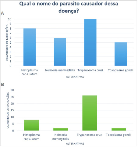 Observando os resultados de Q1 (Figura 4-A), ao questionar os alunos sobre o nome do parasito causador da doença de Chagas, constatou-se um número maior de marcações na resposta Trypanosoma cruzi, o que correspondeu à metade dos alunos que responderam ao questionário. A segunda alternativa com maior marcação foi Histoplasma capsulatum (21%), o que pode ser atribuído ao fato de os alunos terem estudado esse conteúdo recentemente. As demais alternativas ficaram com a quantidade de marcações pouco distintas, tendo Toxoplasma gondii apresentado 13% de marcações, e Neisseria meningitidis, 16%.
