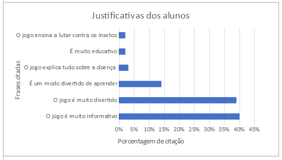 Todos os 38 alunos afirmaram acreditar que o jogo foi capaz de ensinar conceitos sobre a doença de Chagas. No espaço reservado para que eles pudessem justificar a resposta dada, foram evidenciadas as frases da Figura 5, com suas respectivas porcentagens de citação.