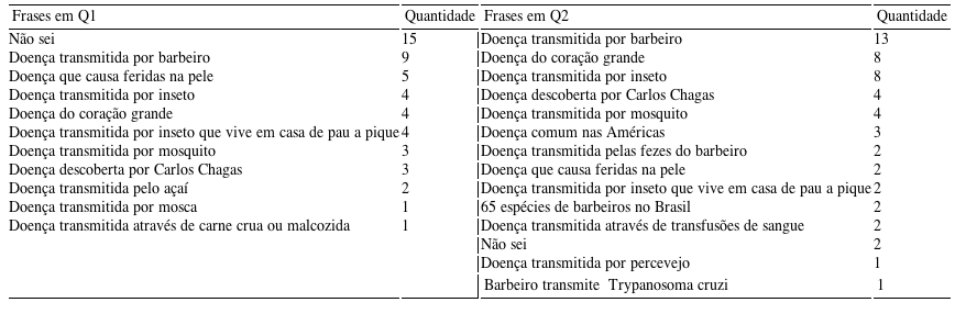 Mais da metade (66%) dos alunos analisados apontaram já ter estudado sobre a doença de Chagas em alguma atividade educativa, entretanto observamos muitas dúvidas e equívocos nas respostas dadas a uma das questões propostas, que pedia para os alunos descreverem, de forma aberta, o que sabiam sobre a doença. As frases mais citadas em Q1 e em Q2, referentes à questão, encontram-se listadas a seguir, da mais citada para a menos citada.